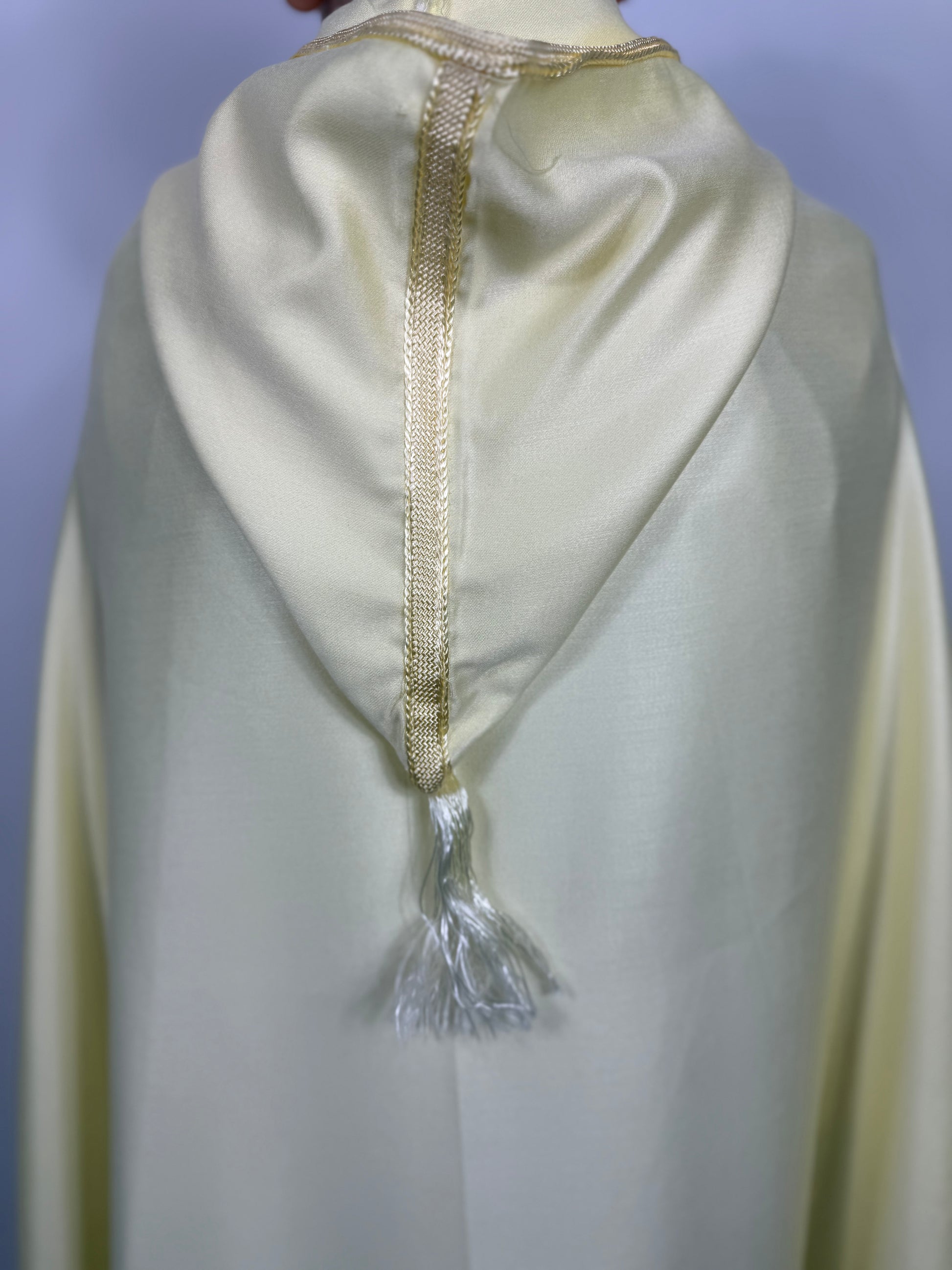 Idéal pour les mariages, fêtes religieuses et cérémonies familiales, ce barnous jaune est une pièce forte qui allie tradition, prestance et modernité.