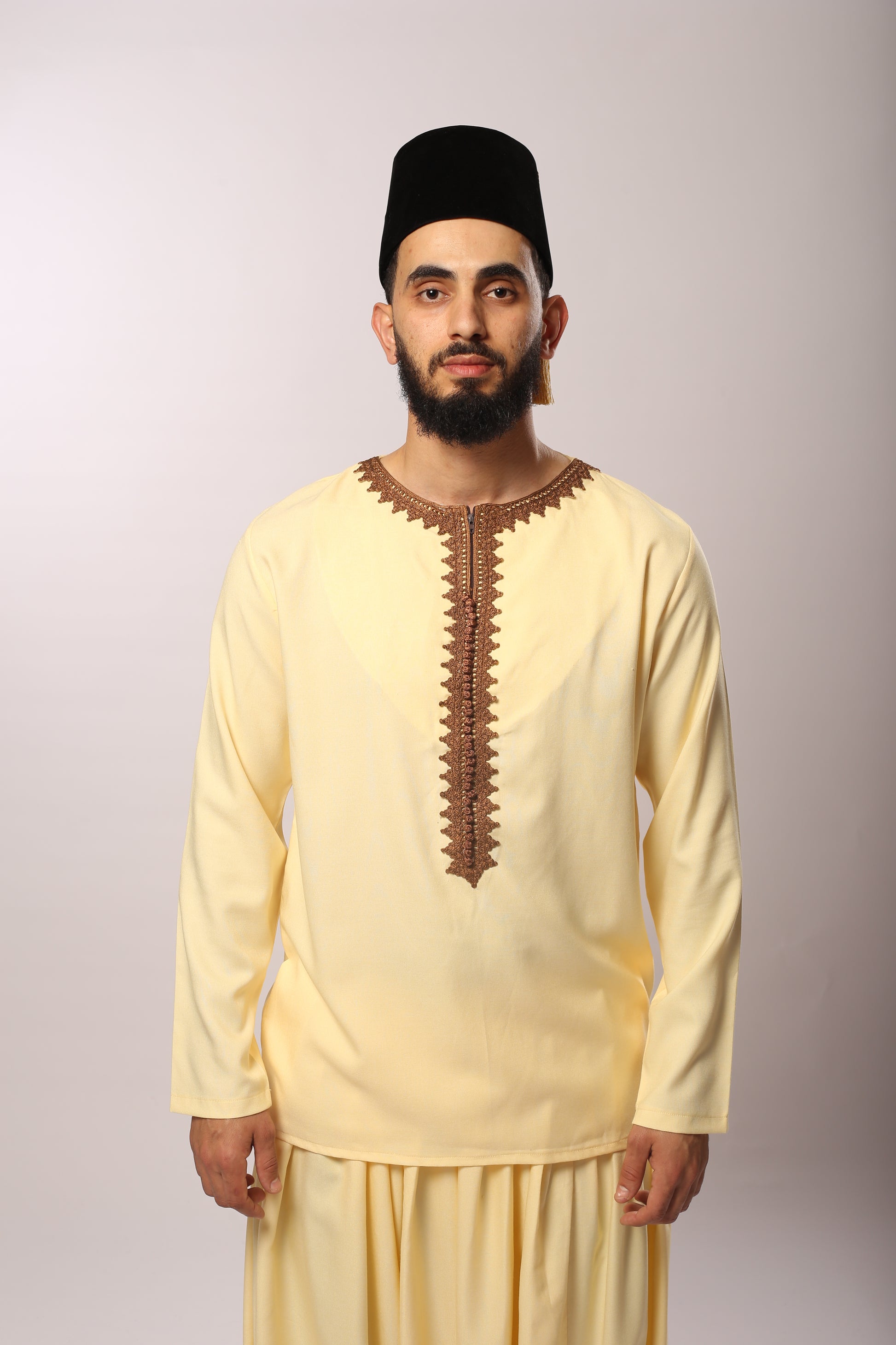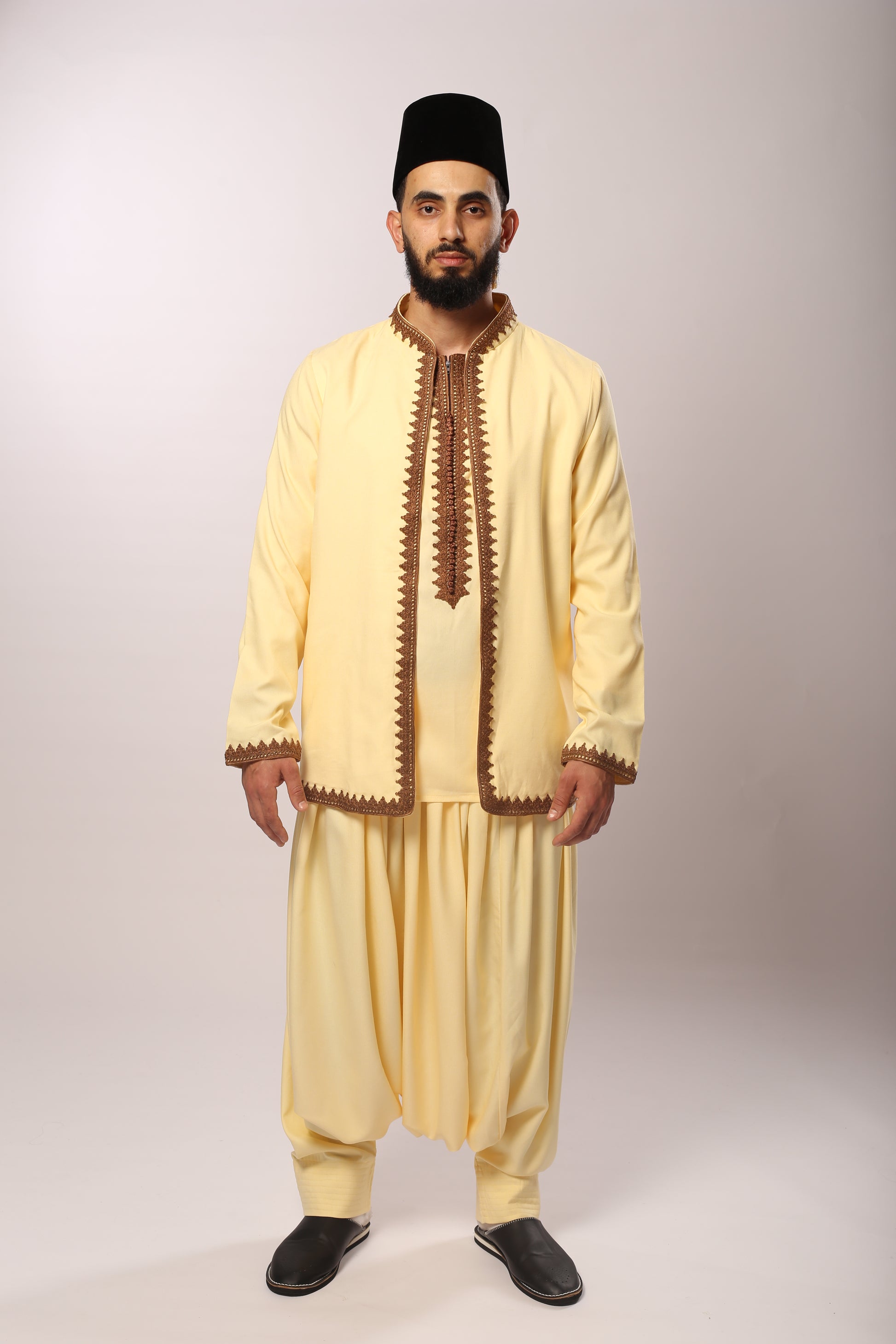 Décliné dans une couleur crème élégante, l’ensemble est rehaussé de broderies marron délicates, apportant profondeur, contraste et authenticité. Les finitions soignées et le style andaloussi font de cette tenue un choix idéal pour les mariages, fiançailles et occasions spéciales.